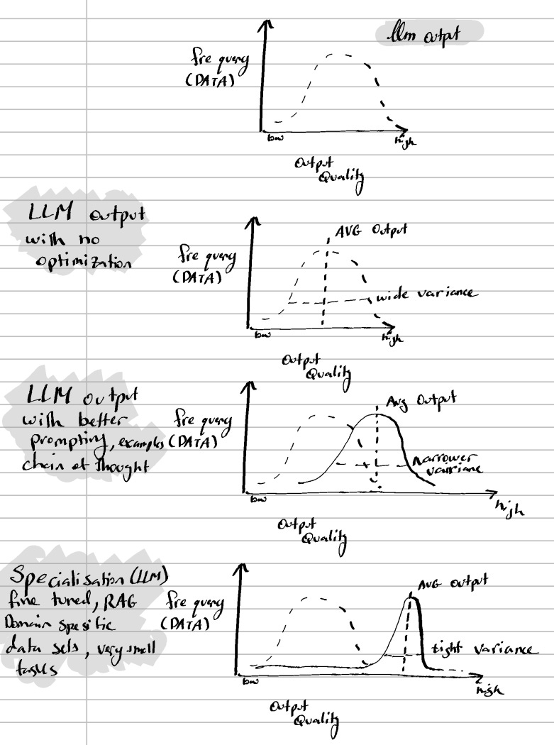 I think a conversation about Gen-AI, especially today, requires a look at what risks and compromises you accept when using it exclusively. When using Gen-AI technology, such as an LLM, you are essentially working with a large collection of data, trying to find the most probable output for each request. This process itself is a collection of statistical problems, and the output varies in ways that is statistically bounded but not guaranteed, meaning that you are likely to generate the same or similar output, but you will not necessarily get it. I'm going to better illustrate it (there's an image below), but you are working within a frame of a bell curve. Engineers are working hard to shift your average output as much as possible toward quality while reducing variance. However, the whole driver of improved LLM output has been a drive for larger models with larger context windows (according to recent studies I read, having a strong positive relationship with model size and model output). This means these huge foundational models built largely on global internet data are exposed to not the best quality of information, increasing the difficulty to improve the “average” of average internet data. On top of that, you are significantly bottlenecked in your ability to utilize these tools to their best potential in order to even guarantee the best possible output to generate from them. I think we all noticed that people use Gen AI in different capacities and with different levels of understanding. I think the current latter framework is the best in grouping different classes of users: